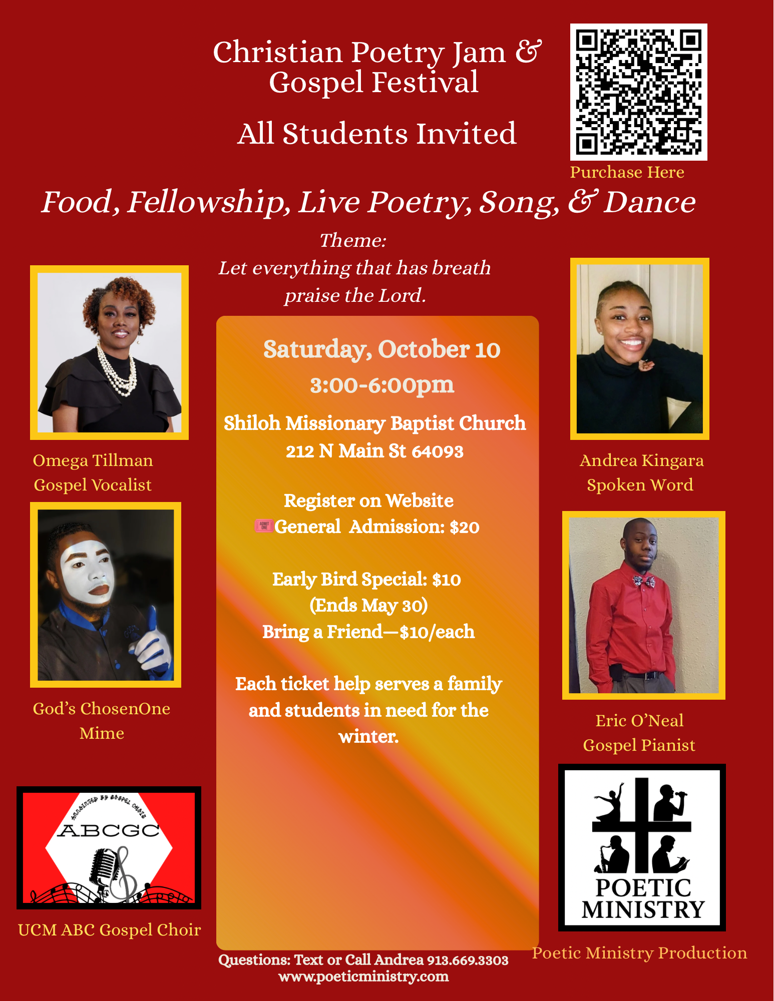 Selected youth will have the opportunity to perform one selection at the "Christian Poetry Jam" along side other professional singers, poets, and musicians. Only two youth performers will be selected to showcase their gifts at the Christian Poetery Jam (Spring or Fall Session).